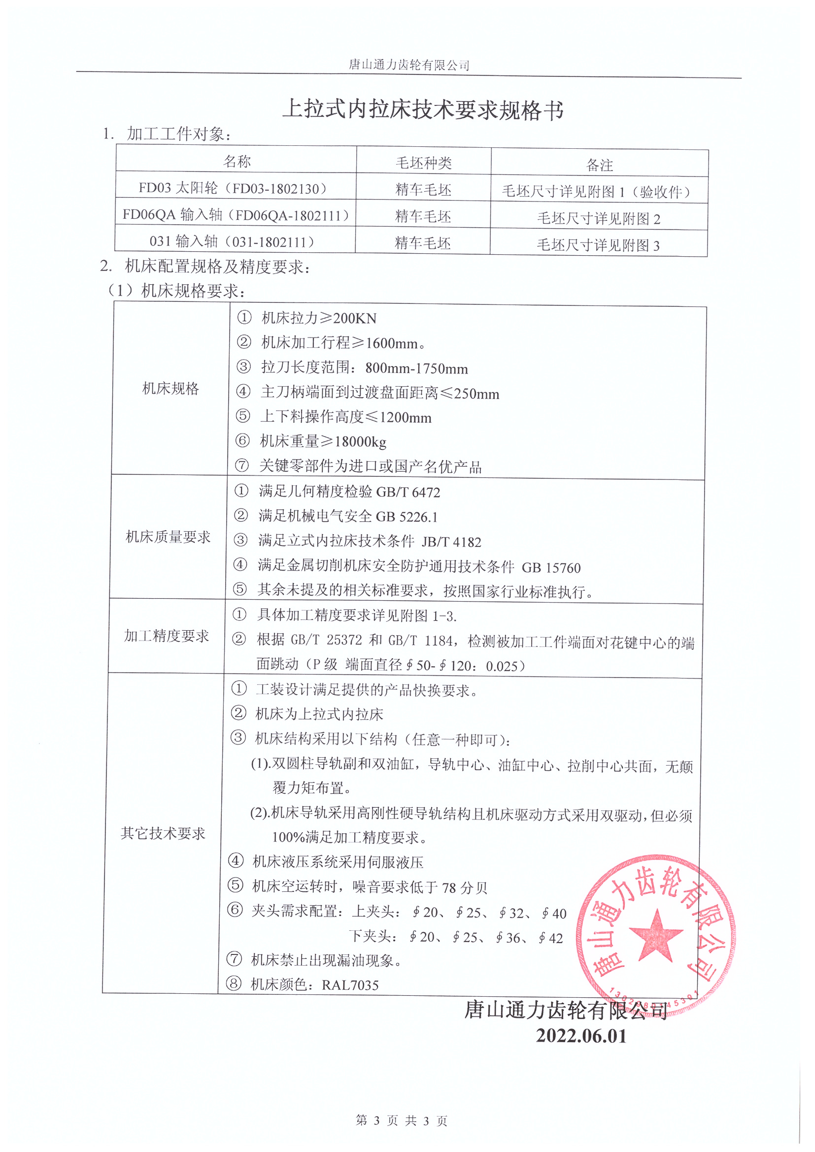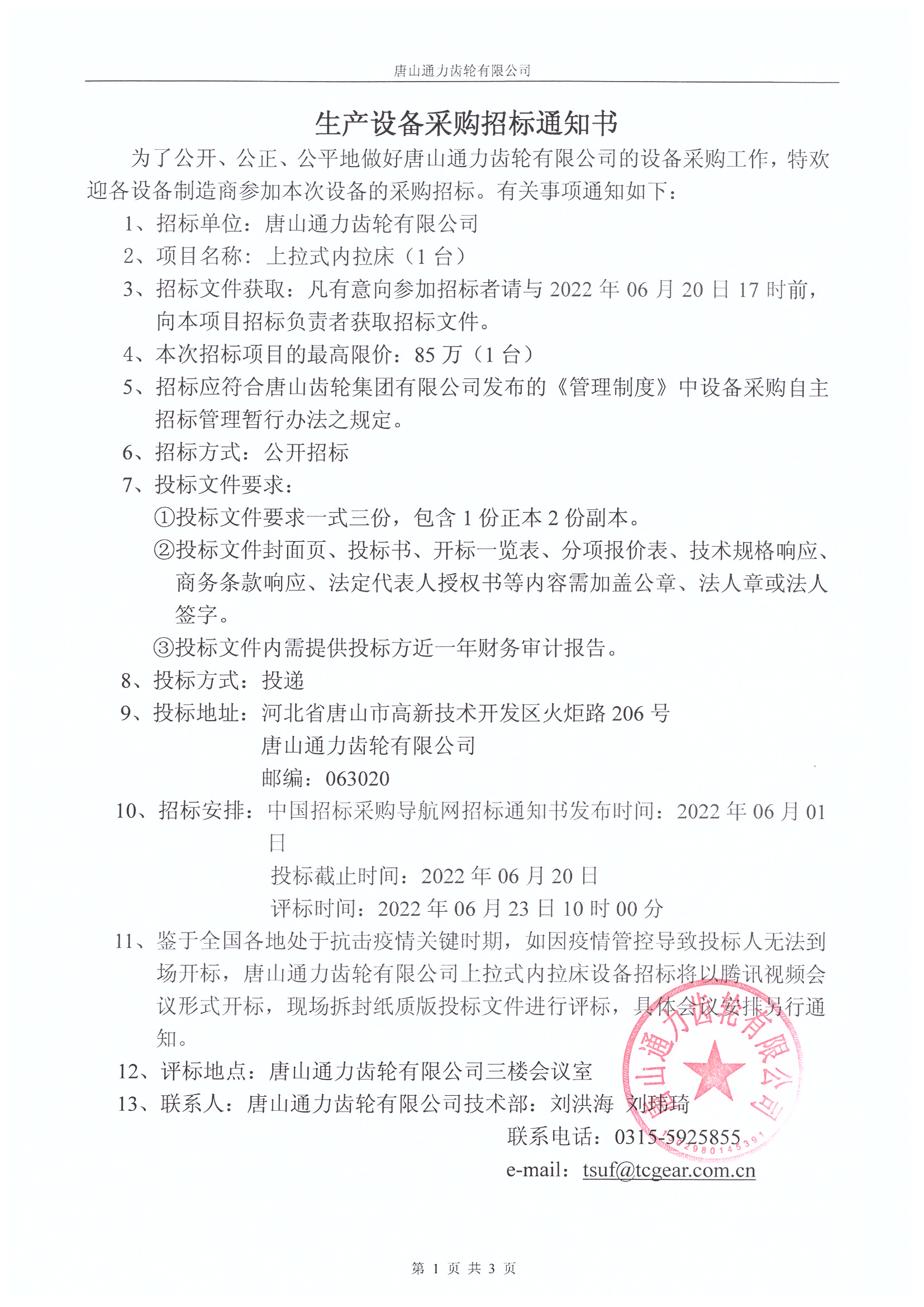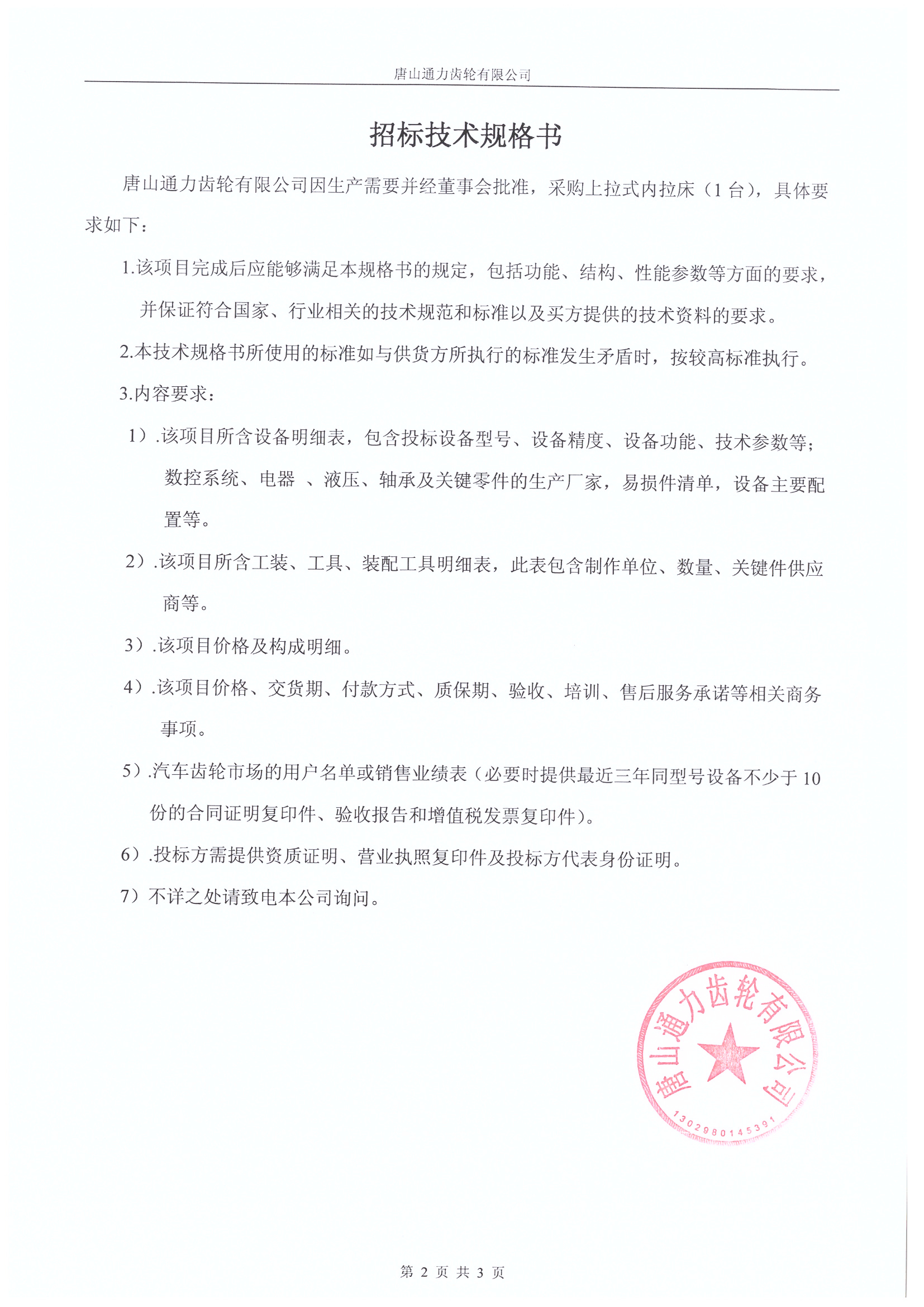 唐山通力齿轮有限公司关于上拉式内拉床(1台)项目招标公告