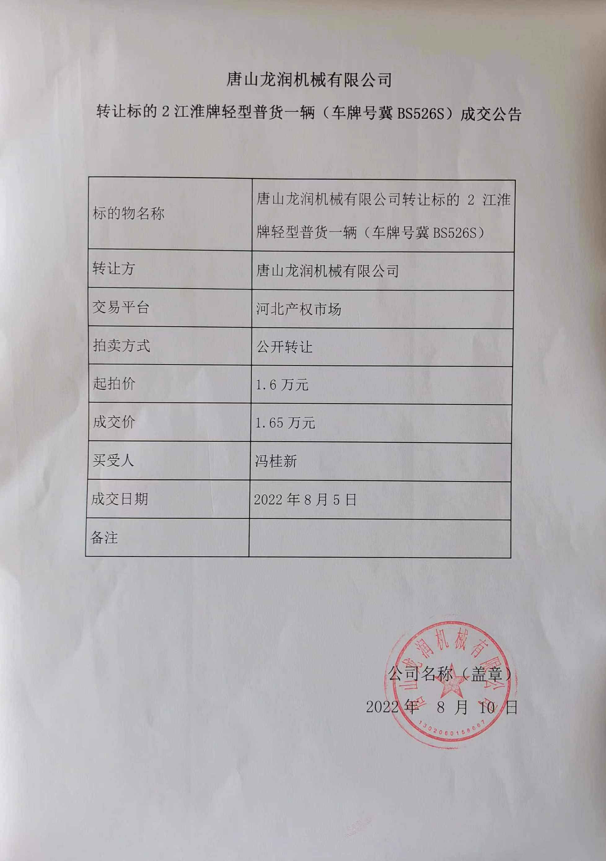 唐山龙润机械有限公司转让标的2江淮牌轻型普货一辆(车牌号冀BS526S)成交公告